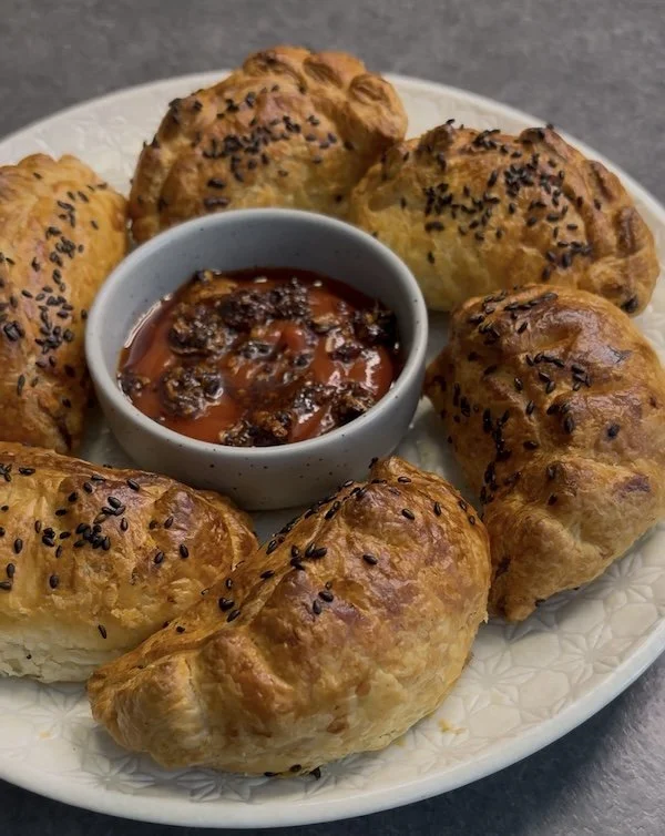 place a heap tablespoon of filling onto each puff pastry disc, lightly brush the edge with a bit of water and pleat into a dumpling shape